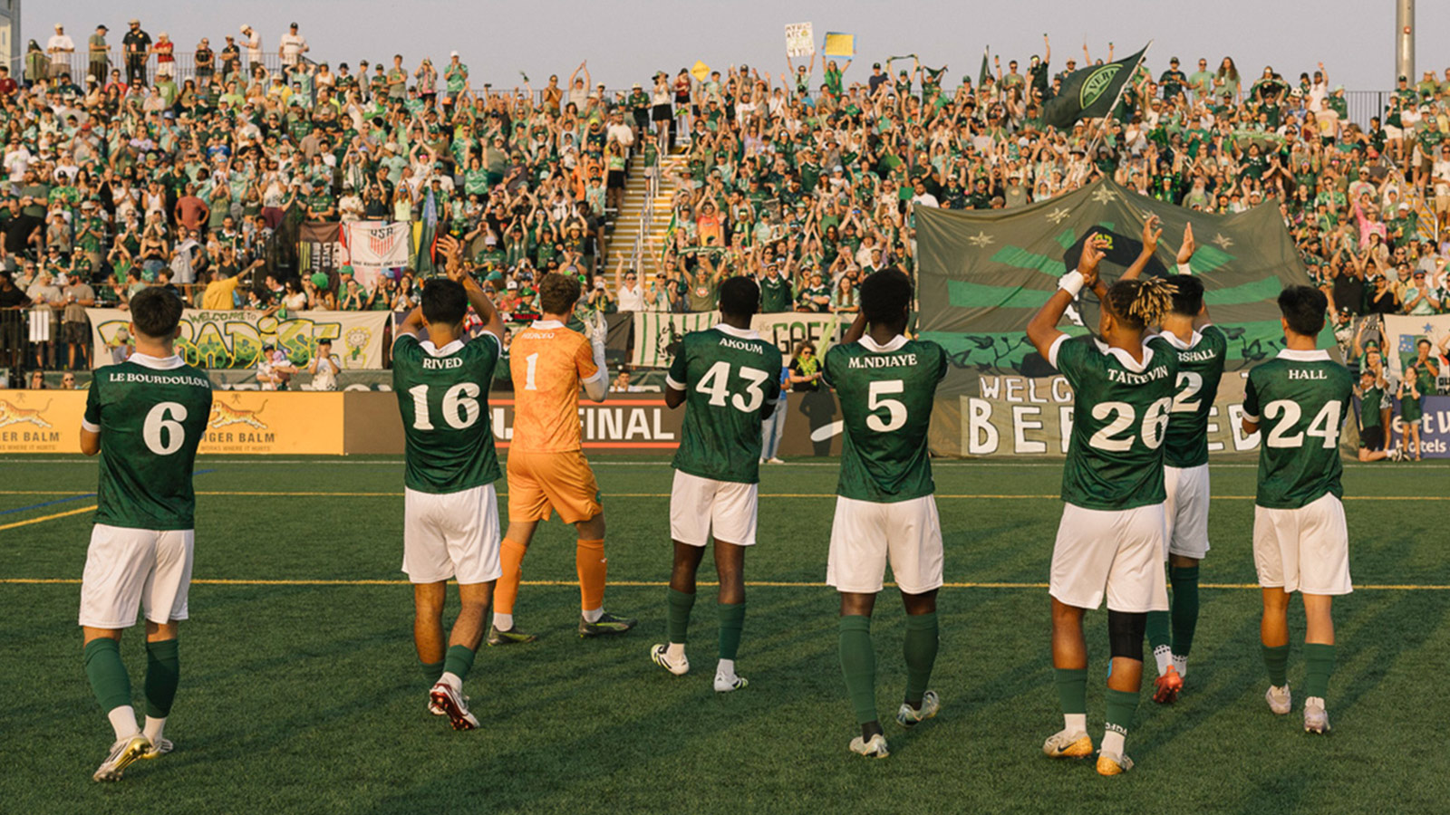 Vermont Green FC scored TWICE in stoppage time to earn a 2-2 draw at Western Mass Pioneers on Friday night, finishing atop the Northeast Division table and lifting the first trophy in club history. The goals—scored by Zach Zengue and Owen O’Malley—came in the 95th and 99th minute, and completed an undefeated regular season.